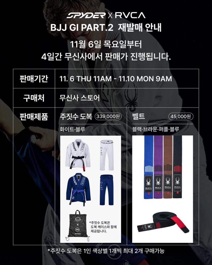 글로벌 프리미엄 스포츠 브랜드 스파이더(SPYDER)가 스트리트 감성 브랜드 RVCA(루카)와 협업한 주짓수 도복 ‘SPYDER X RVCA BJJ GI PART.2’를 오는 11월 6일(목) 오전 11시부터 4일간 무신사 스토어에서 재발매한다.